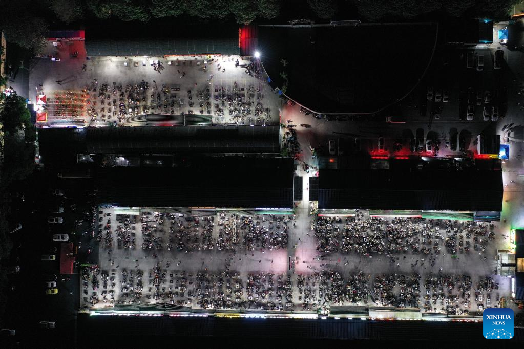 This aerial photo taken on May 8, 2023 shows people enjoying Zibo-style barbecue cuisine in Zhangdian District of Zibo, east China's Shandong Province. (Xinhua/Xu Suhui)