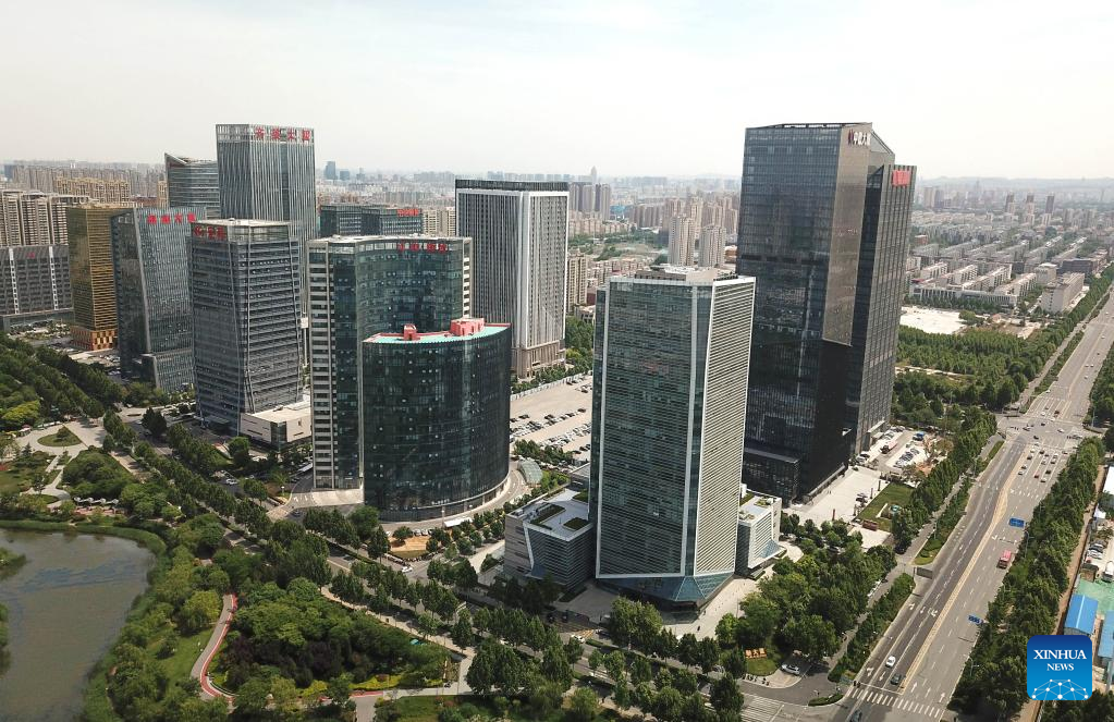 This aerial photo taken on May 8, 2023 shows a view of the financial center in Zhangdian District of Zibo, east China's Shandong Province. (Xinhua/Xu Suhui)?