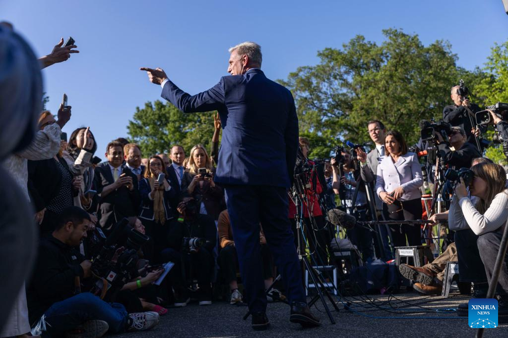 Republican House Speaker Kevin McCarthy speaks to the press after a high-profile debt ceiling meeting in Washington, D.C., the United States, May 9, 2023. Republicans and Democrats are nowhere near a deal after a high-profile debt ceiling meeting failed to yield a breakthrough on Tuesday, risking a debt default that economists warn could cripple the U.S. economy and spawn a financial crisis. (Photo by Aaron Schwartz/Xinhua)