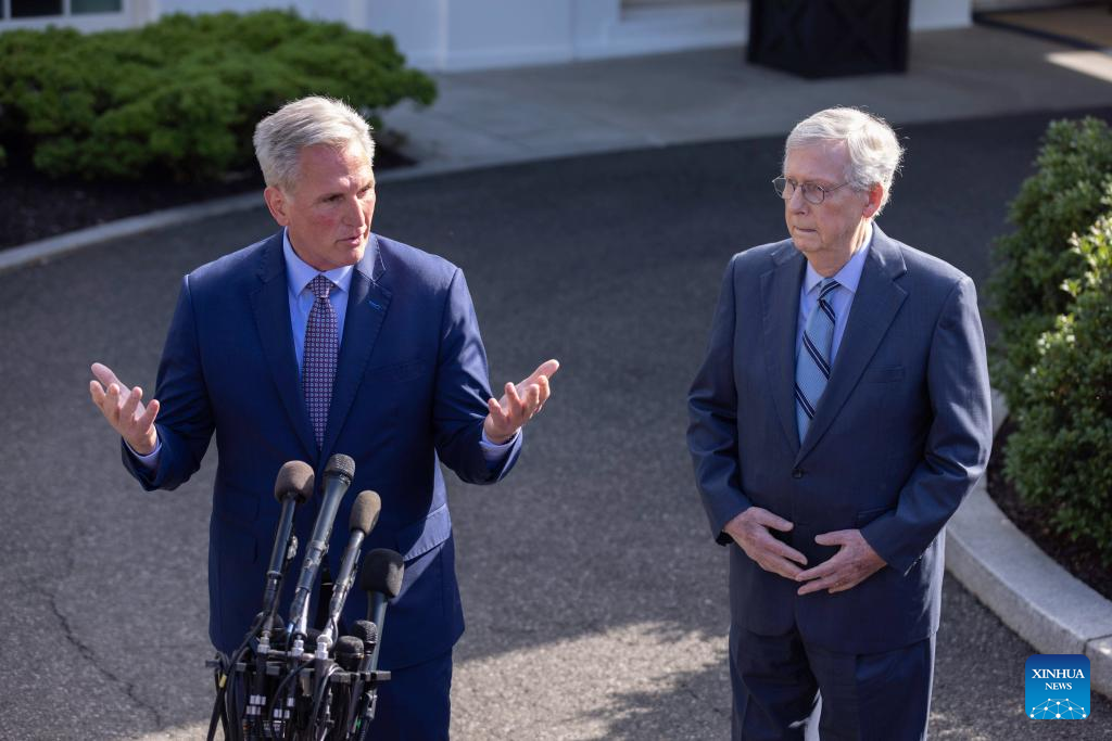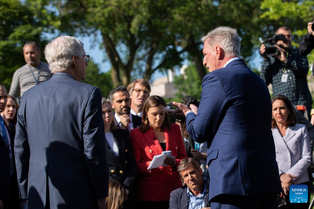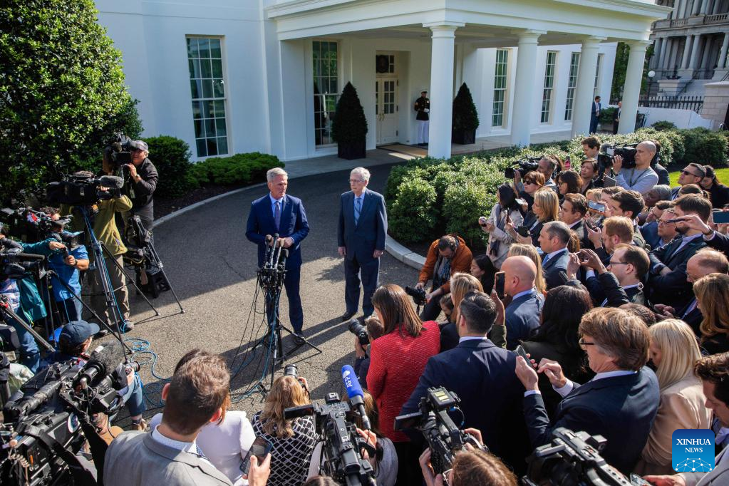 Republican House Speaker Kevin McCarthy (center L) and U.S. Senate Republican Leader Mitch McConnell (center R) speak to the press after a high-profile debt ceiling meeting in Washington, D.C., the United States, May 9, 2023. Republicans and Democrats are nowhere near a deal after a high-profile debt ceiling meeting failed to yield a breakthrough on Tuesday, risking a debt default that economists warn could cripple the U.S. economy and spawn a financial crisis. (Photo by Aaron Schwartz/Xinhua)