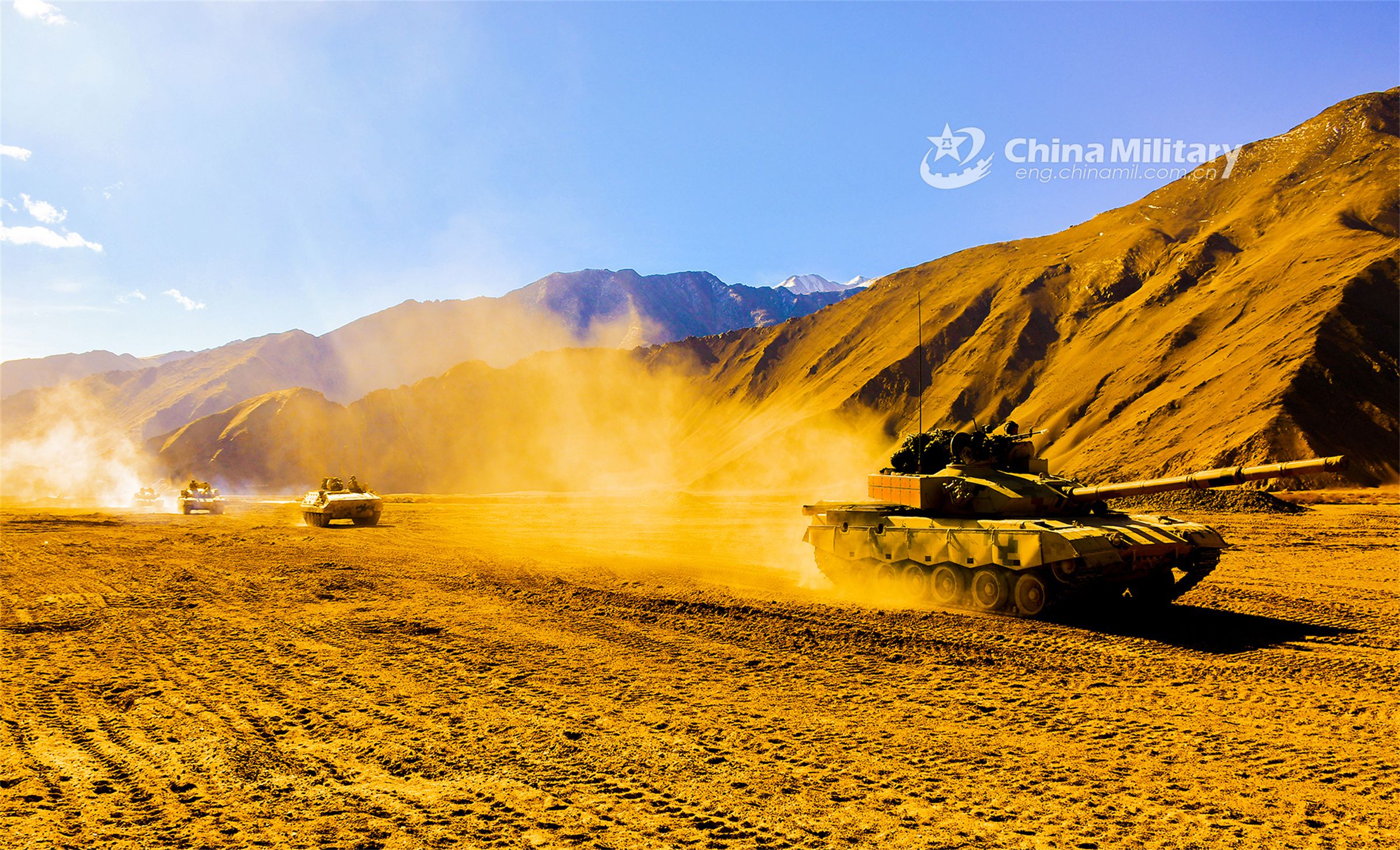 Armored vehicles attached to a brigade under the PLA 77th Group Army kick up plumes of dust as they move forward to designated operating base during a maneuvering operation in northwest China's Gobi desert in early May, 2023. (eng.chinamil.com.cn/Photo by Xie Yongpeng)