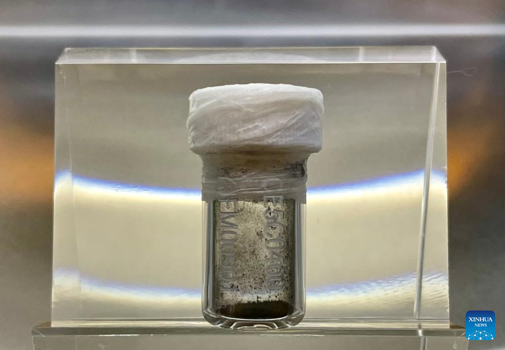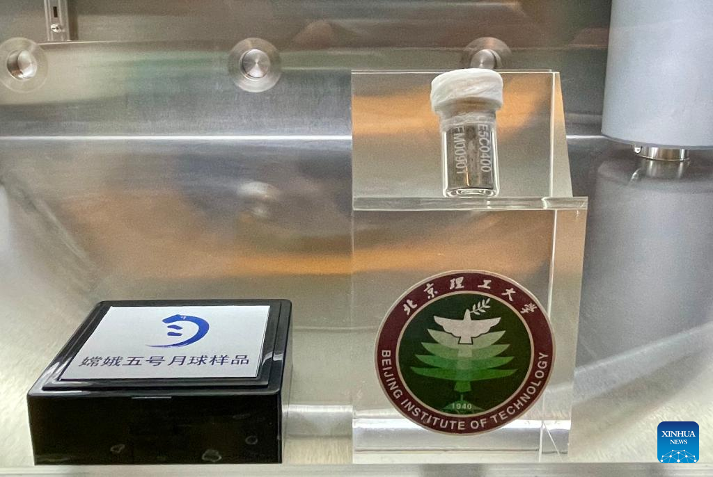 This photo taken on April 24, 2023 shows the lunar samples received by the Beijing Institute of Technology. The Beijing Institute of Technology (BIT) recently received 500 mg of the lunar samples brought back by the Chang'e-5 mission. The research team with BIT will study the material characteristics of these samples and also related additive manufacturing technology, with the building of a future lunar research station in mind.(Xinhua/Zhao Xu)