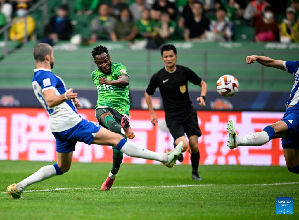 Samuel Adegbenro (2nd L) of Beijing Guoan shoots during a 2023 season Chinese Football Association Super League (CSL) 6th round match between Beijing Guoan and Tianjin Jinmen Tigers at the Worker's Stadium in Beijing, capital of China, May 10, 2023. (Xinhua/Song Yanhua)