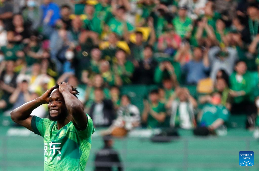 Samuel Adegbenro of Beijing Guoan reacts during a 2023 season Chinese Football Association Super League (CSL) 6th round match between Beijing Guoan and Tianjin Jinmen Tigers at the Worker's Stadium in Beijing, capital of China, May 10, 2023. (Xinhua/Jia Haocheng)