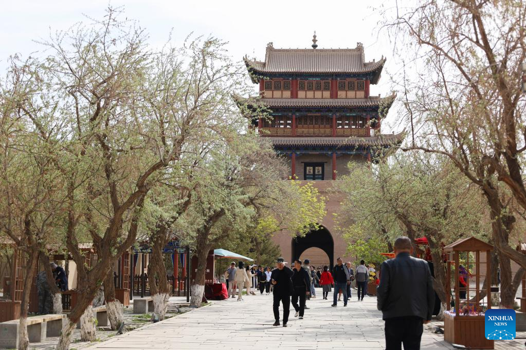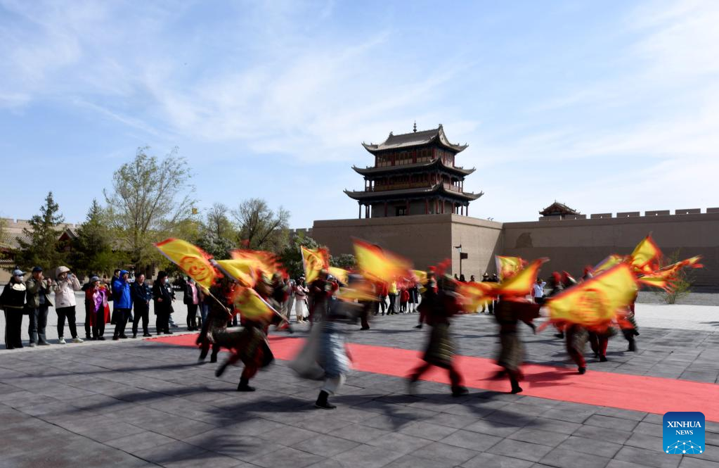Visitors watch a performance in the Jiayu Pass scenic spot in Jiayuguan City, northwest China's Gansu Province, May 10, 2023. As a national-level cultural heritage site, the Jiayu Pass is the starting point of a section of the Great Wall built during the Ming Dynasty (1368-1644). Recently, the Jiayu Pass scenic spot has attracted many tourists. (Xinhua/Ma Xiping)