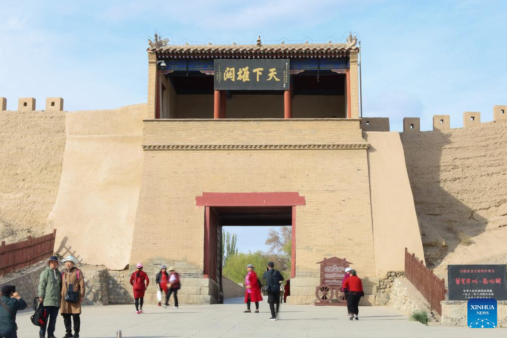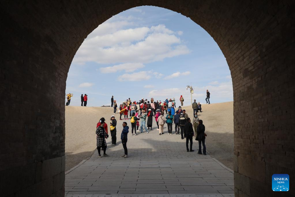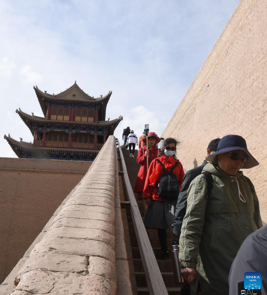 People visit the Jiayu Pass scenic spot in Jiayuguan City, northwest China's Gansu Province, May 10, 2023. As a national-level cultural heritage site, the Jiayu Pass is the starting point of a section of the Great Wall built during the Ming Dynasty (1368-1644). Recently, the Jiayu Pass scenic spot has attracted many tourists. (Xinhua/Ma Xiping)