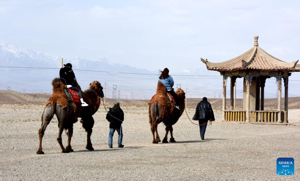 Visitors ride on camels in the Jiayu Pass scenic spot in Jiayuguan City, northwest China's Gansu Province, May 10, 2023. As a national-level cultural heritage site, the Jiayu Pass is the starting point of a section of the Great Wall built during the Ming Dynasty (1368-1644). Recently, the Jiayu Pass scenic spot has attracted many tourists. (Xinhua/Ma Xiping)