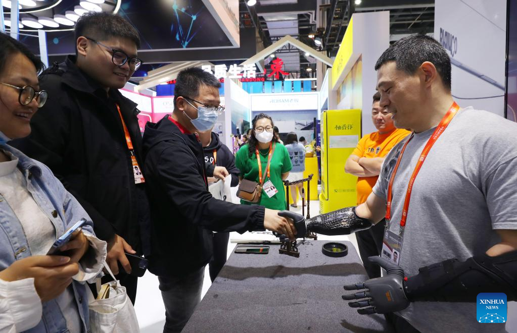 Visitors shake hands with a staff member who wears brain-controlled prosthetic arm at the Exposition on China Brand 2023 in east China's Shanghai, May 10, 2023. The Exposition on China Brand 2023 kicked off Wednesday at the Shanghai World Expo Exhibition and Convention Center. Around 1,000 Chinese enterprises participated in the exposition, showcasing the new look of current Chinese brands to the world.(Xinhua/Fang Zhe)