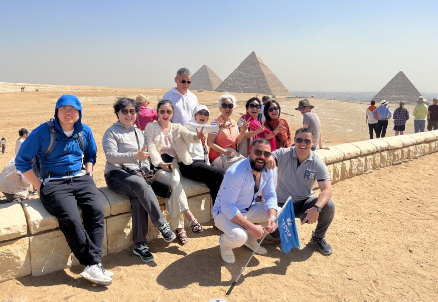 Chinese tourists pose for a picture with local hosts in front of pyramids in Egypt. (Photo from the official account of travel agency Caissa Touristic on WeChat)