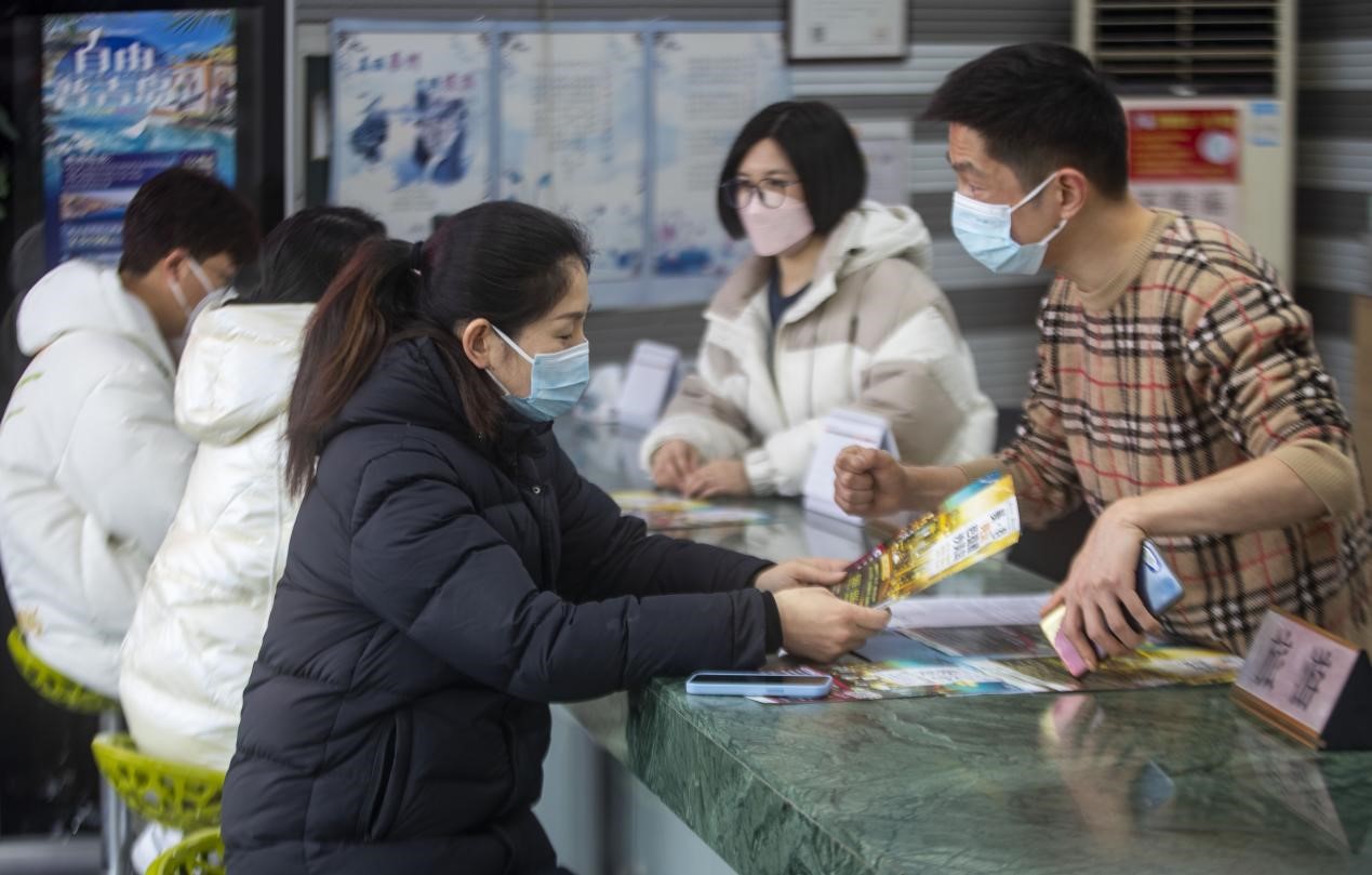 Citizens learn about outbound travel packages in a travel agency in Taizhou, east China's Jiangsu province, Feb. 9, 2023. (People's Daily Online/Tang Dehong)