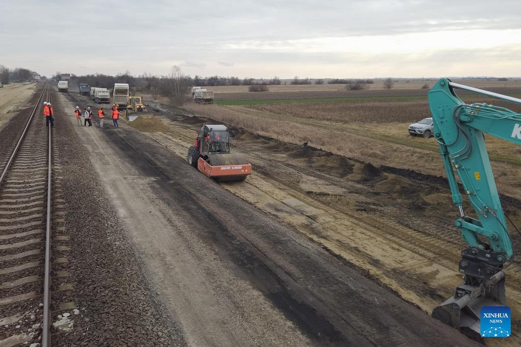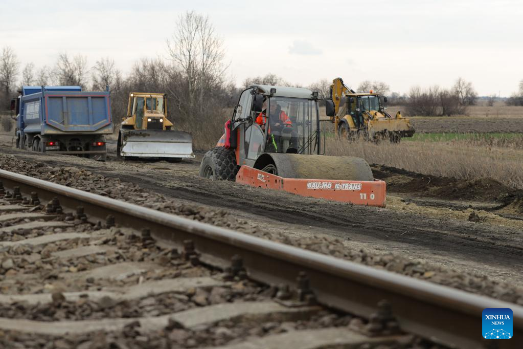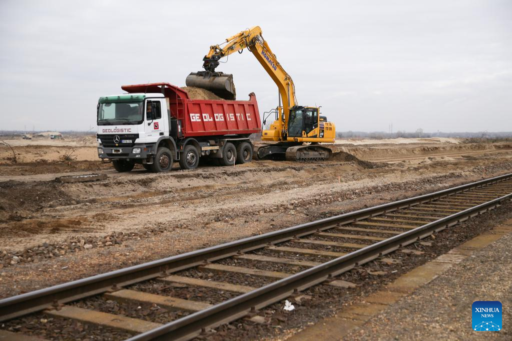 Engineering vehicles are busy at a construction site of Hungary-Serbia railway project in Delegyhaza, Hungary, Feb. 22, 2023. (Xinhua/Zheng Huansong)