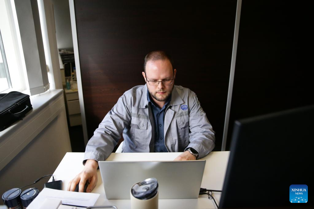 Bartha Gyorgy Janos works at China Railway Electrification Engineering Group (Hungary) Kft. in Budapest, Hungary, Feb. 22, 2023. (Xinhua/Zheng Huansong)