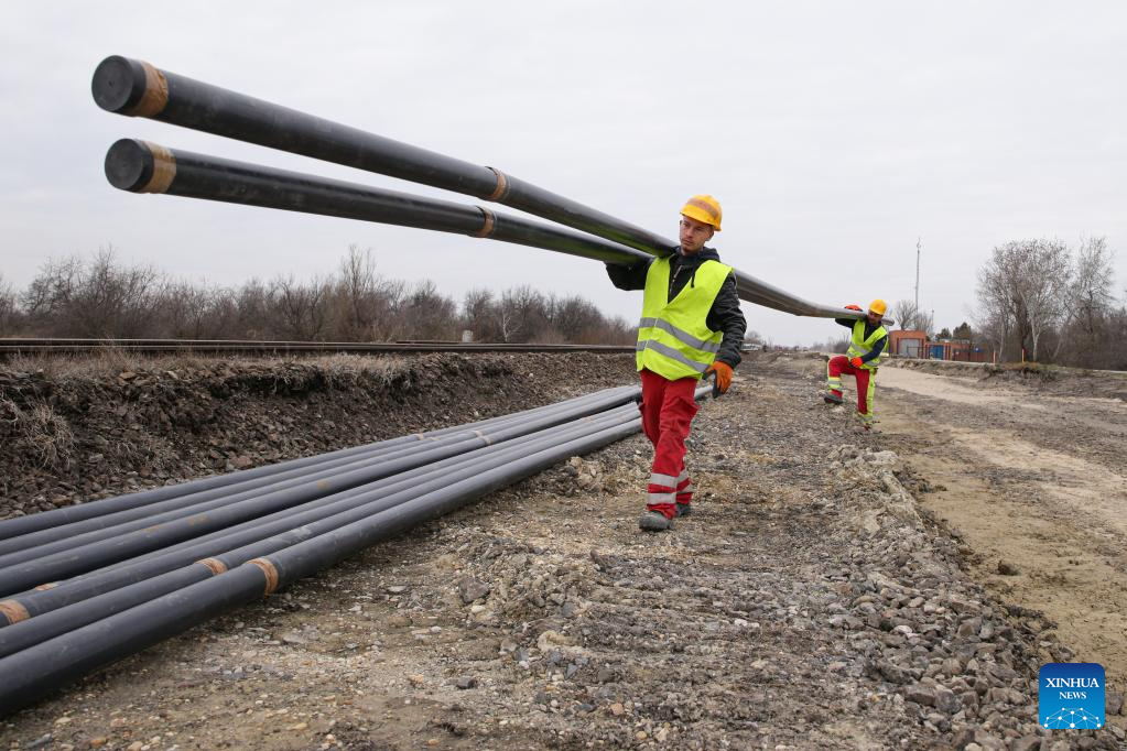Workers carry electrical conduits at a construction site of Hungary-Serbia railway project in Szabadszallas, Hungary, Feb. 22, 2023. (Xinhua/Zheng Huansong)