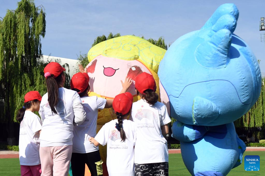 Participates react with mascots of Hangzhou Asian Games during the Hangzhou Asian Games fun run event at National Olympic Academy of Iran in Tehran, Iran, May 11, 2023. (Xinhua/Shadati)