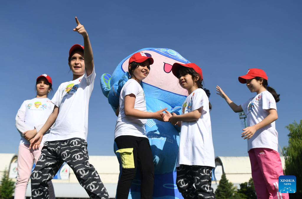 Participates react with a mascot of Hangzhou Asian Games during the Hangzhou Asian Games fun run event at National Olympic Academy of Iran in Tehran, Iran, May 11, 2023. (Xinhua/Shadati)