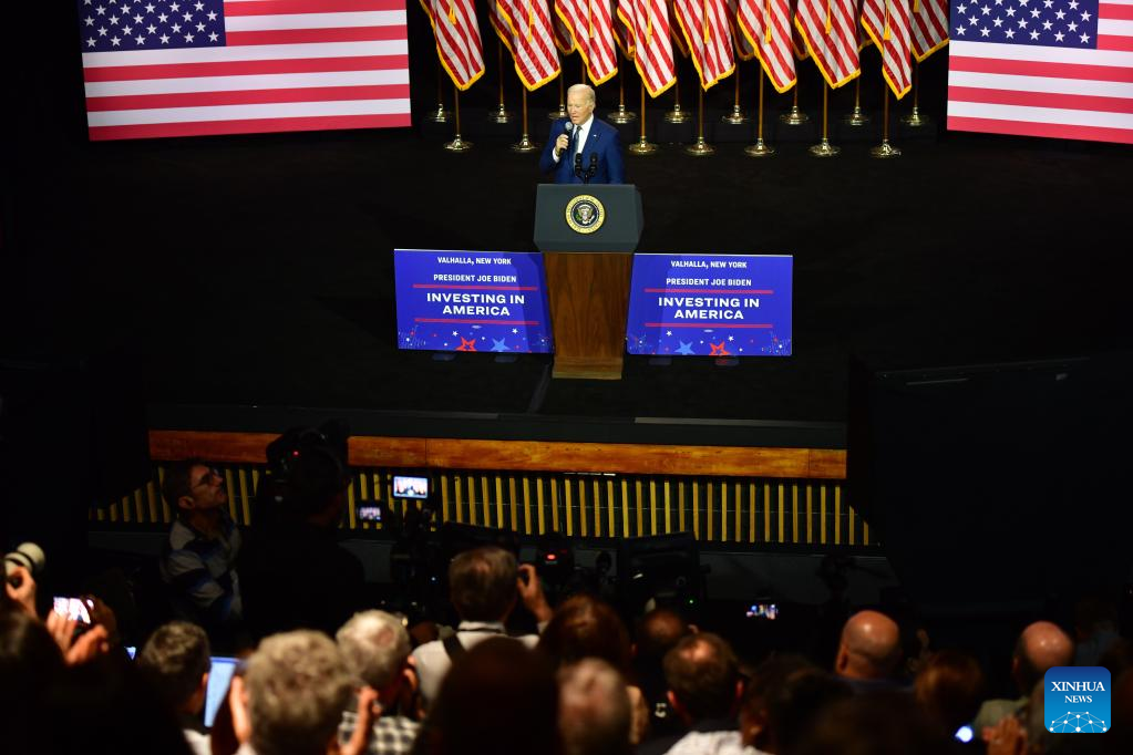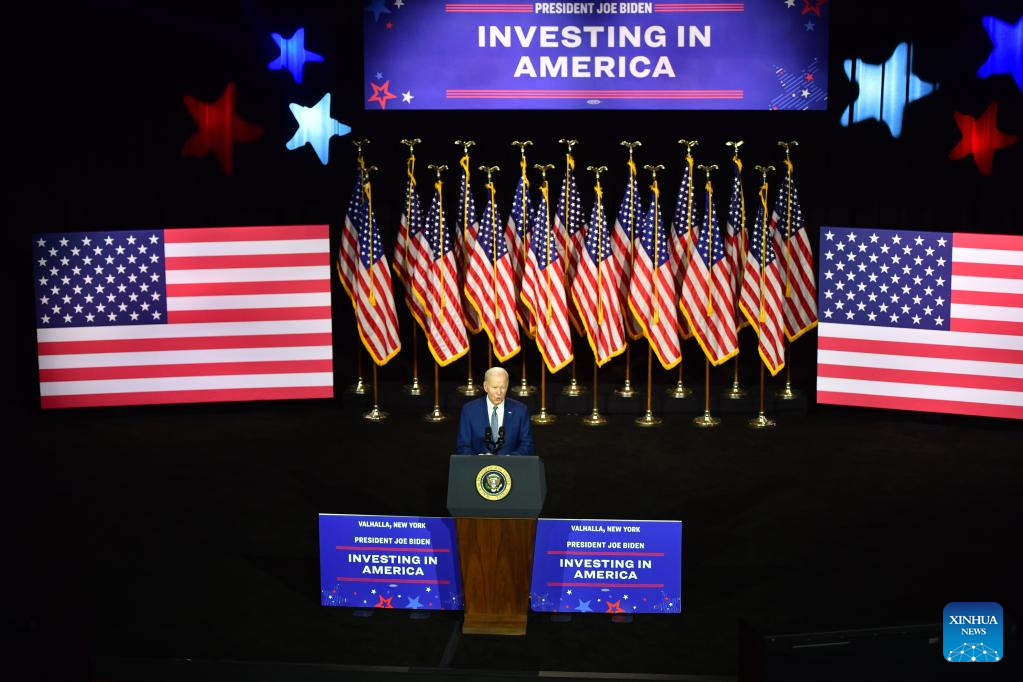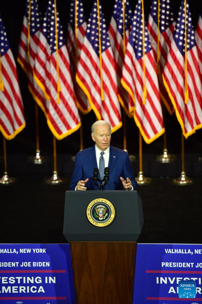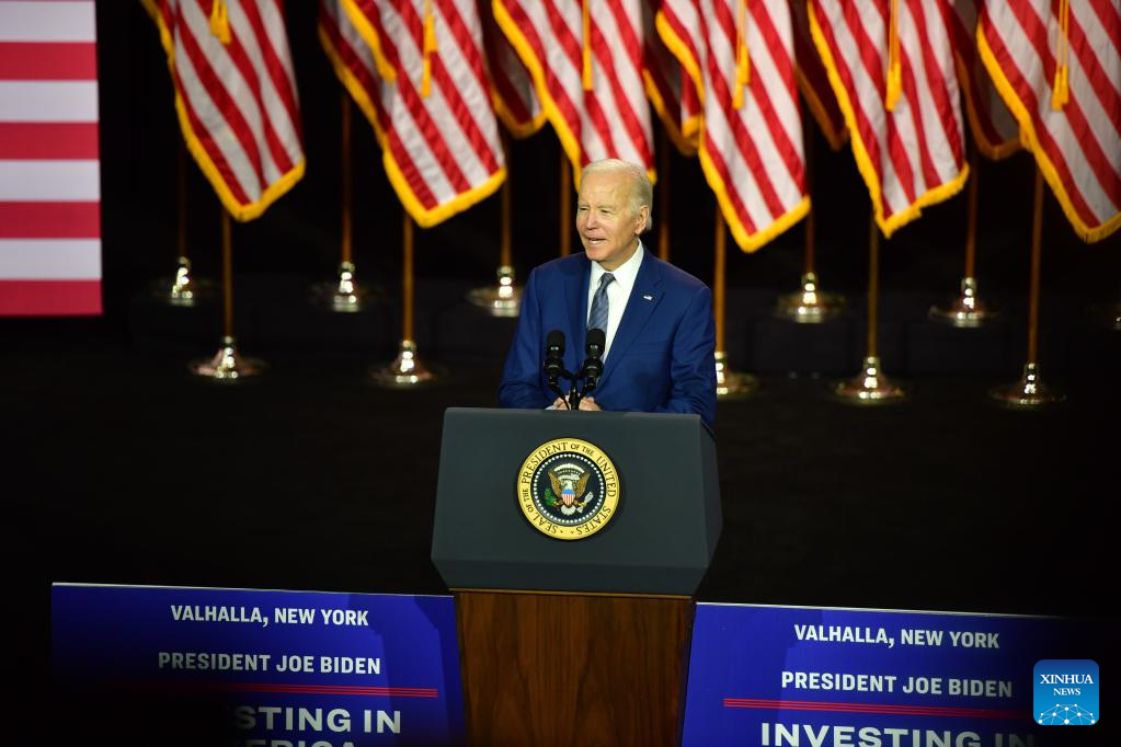 U.S. President Joe Biden speaks at SUNY Westchester Community College in Valhalla, New York, the United States, on May 10, 2023. (Photo by Mykyta Starychenko/Xinhua)