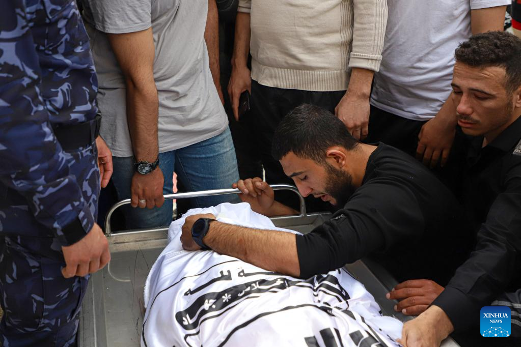 A man mourns over the body of a Palestinian who was killed in an Israeli airstrike at a hospital in Gaza City, on May 11, 2023. Israeli fighter jets Thursday continued intensive airstrikes on the Gaza Strip for a third day in a row in response to rockets fired towards Israel, leaving 28 Palestinians killed and 93 injured. (Photo by Rizek Abdeljawad/Xinhua)