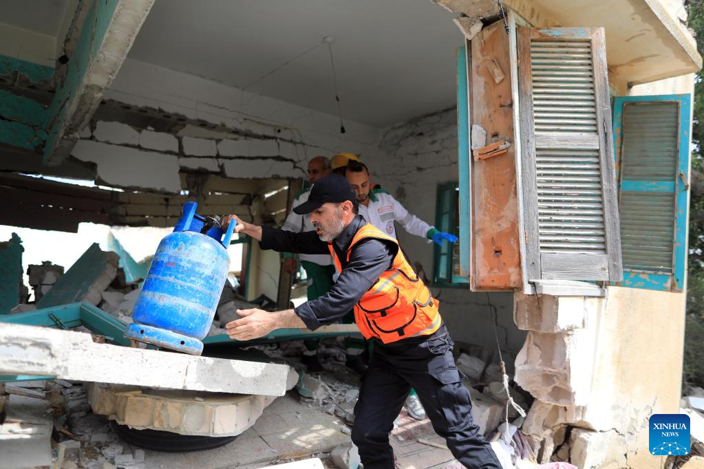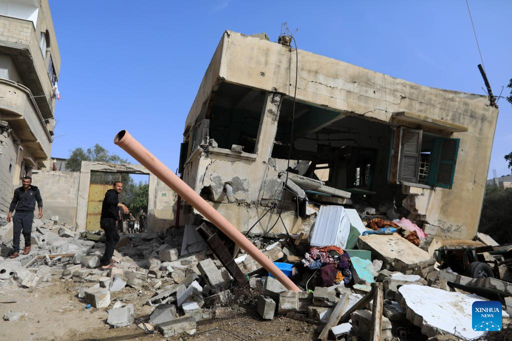 People inspect a damaged house following an airstrike in the southern Gaza Strip city of Khan Younis, on May 11, 2023. Israeli fighter jets Thursday continued intensive airstrikes on the Gaza Strip for a third day in a row in response to rockets fired towards Israel, leaving 28 Palestinians killed and 93 injured. (Photo by Yasser Qudih/Xinhua)