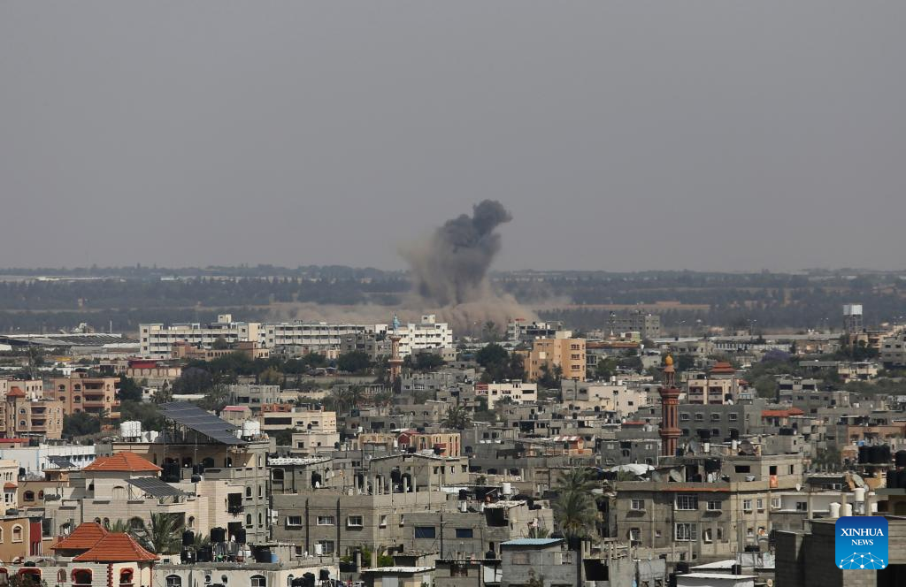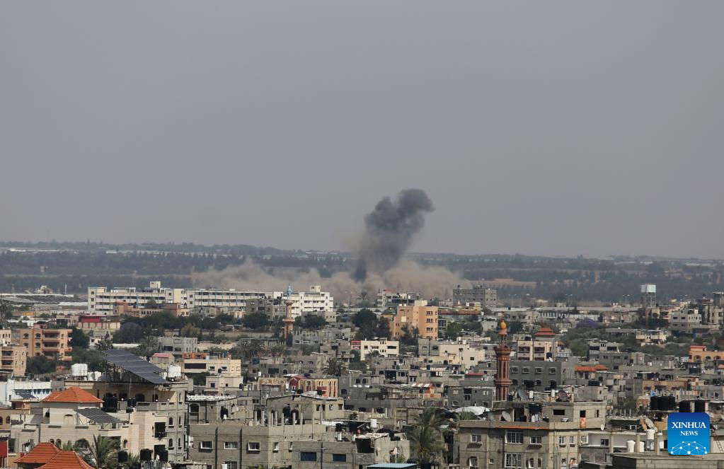 Smoke rises following an Israeli airstrike in the southern Gaza Strip city of Rafah, on May 11, 2023. Israeli fighter jets Thursday continued intensive airstrikes on the Gaza Strip for a third day in a row in response to rockets fired towards Israel, leaving 28 Palestinians killed and 93 injured. (Photo by Khaled Omar/Xinhua)