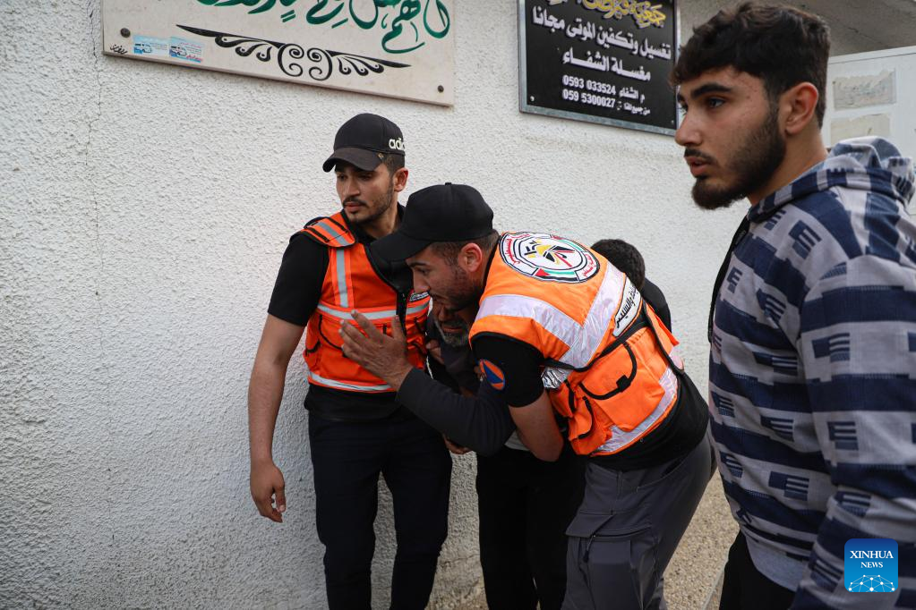 A man mourns his relative killed in an Israeli airstrike at a hospital in Gaza City, on May 11, 2023. Israeli fighter jets Thursday continued intensive airstrikes on the Gaza Strip for a third day in a row in response to rockets fired towards Israel, leaving 28 Palestinians killed and 93 injured. (Photo by Rizek Abdeljawad/Xinhua)