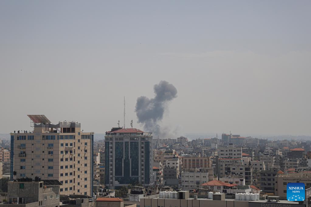 Smoke rises following an Israeli airstrike in Gaza City, on May 11, 2023. Israeli fighter jets Thursday continued intensive airstrikes on the Gaza Strip for a third day in a row in response to rockets fired towards Israel, leaving 28 Palestinians killed and 93 injured. (Photo by Rizek Abdeljawad/Xinhua)