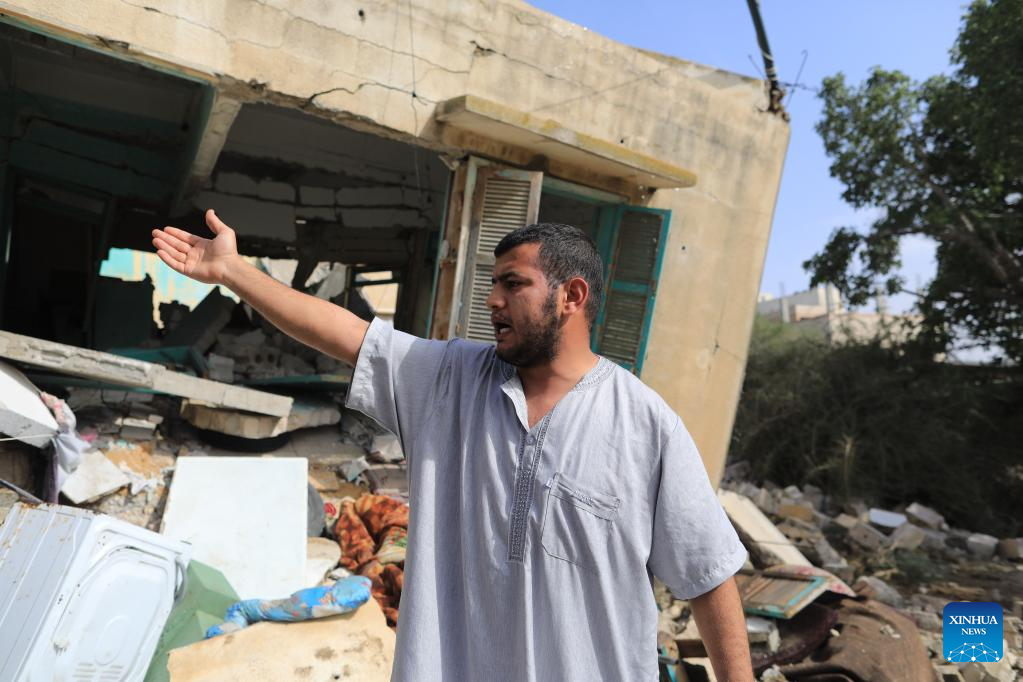 A man stands in front of a damaged house following an airstrike in the southern Gaza Strip city of Khan Younis, on May 11, 2023. Israeli fighter jets Thursday continued intensive airstrikes on the Gaza Strip for a third day in a row in response to rockets fired towards Israel, leaving 28 Palestinians killed and 93 injured. (Photo by Yasser Qudih/Xinhua)