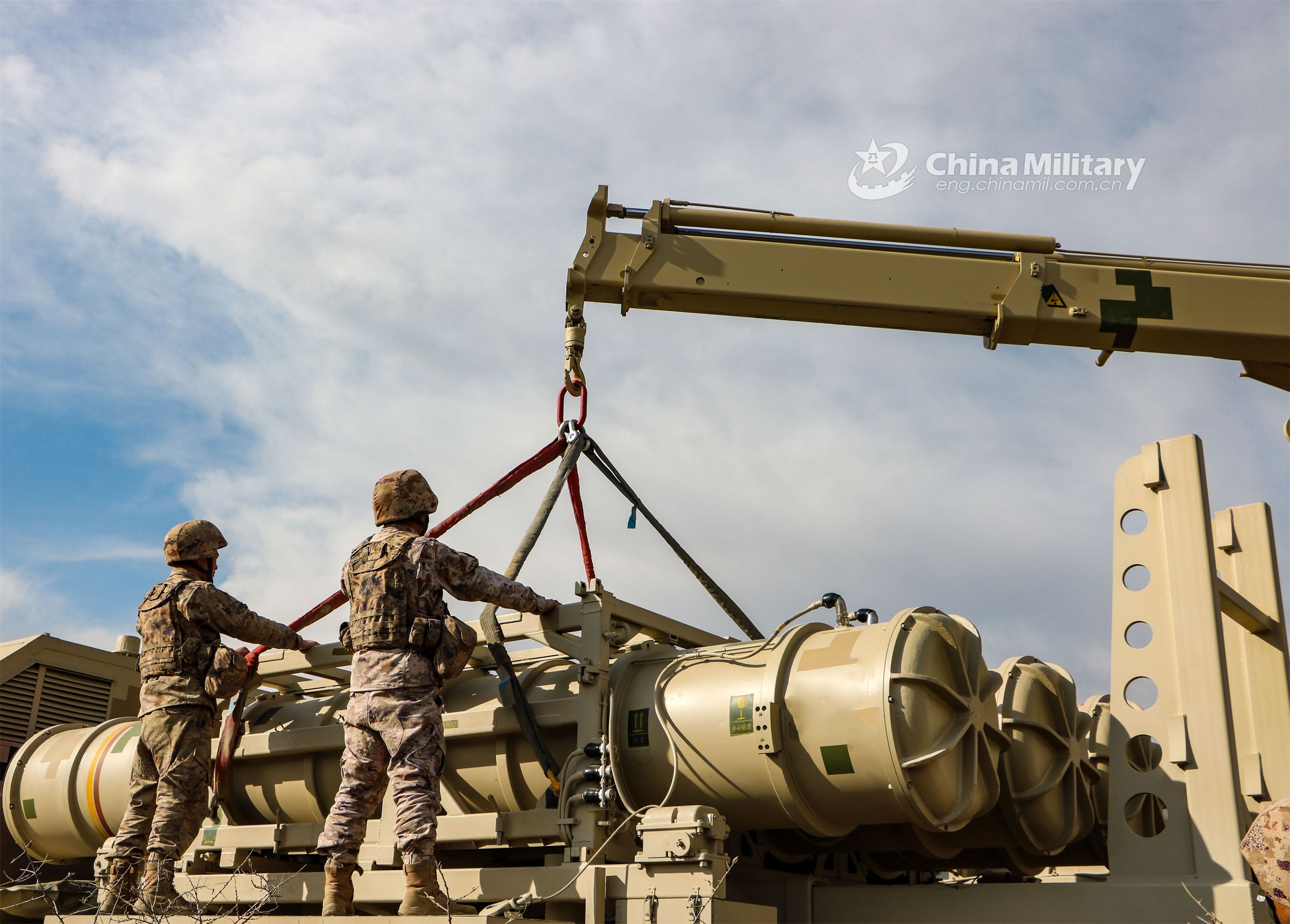 Soldiers assigned to a brigade under the PLA Xizang Military Command hoist and load air-defense missiles during a recent force-on-force live exercise. (eng.chinamil.com.cn/Photo by Lu Yujiang)