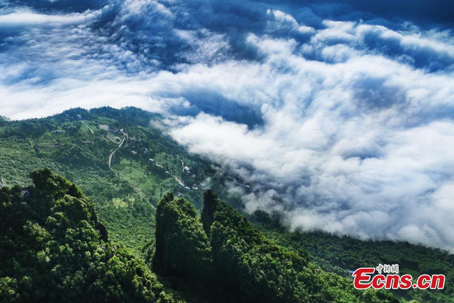 Dense clouds fill the Enshi Grand Canyon in central China's Hubei Province. The Enshi Grand Canyon is a typical karst landscape, with cliffs, caves, rock pillars, subsurface streams and waterfalls. (Photo: China News Service/Zhang Yuanming)