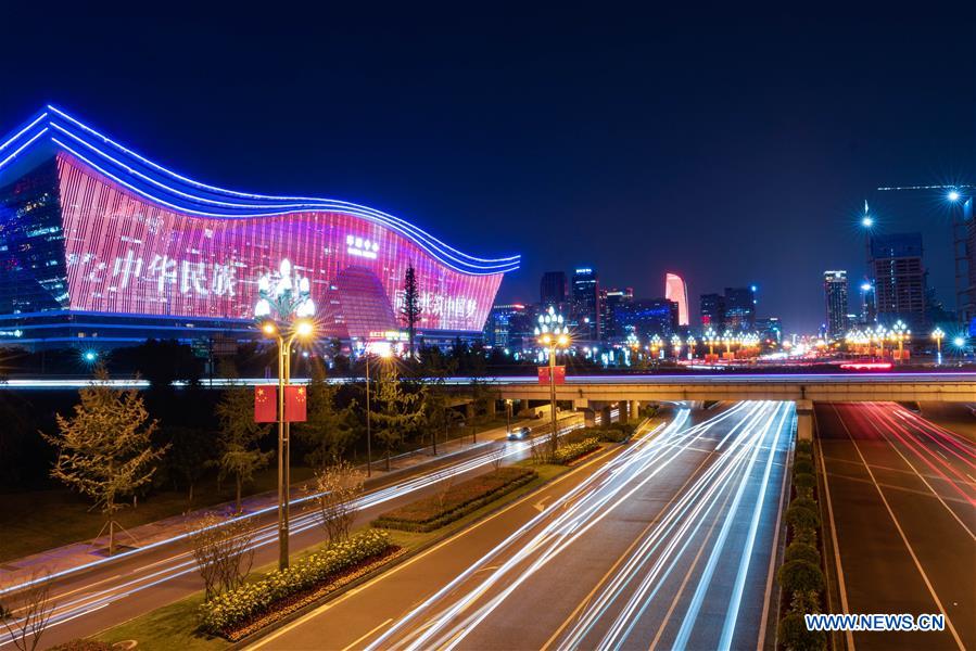 Photo taken on Sept. 29, 2020 shows a light show staged at Global Center in Chengdu, capital of southwest China's Sichuan Province. (Xinhua/Zhang Kefan)