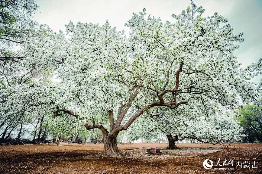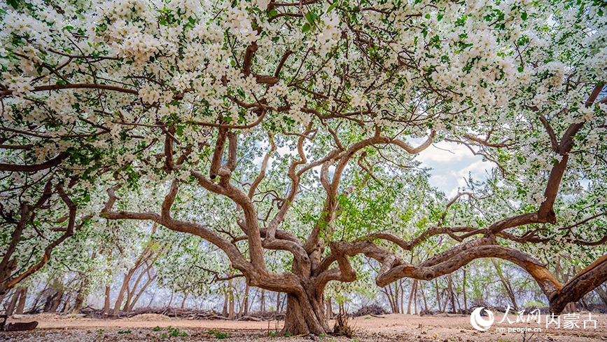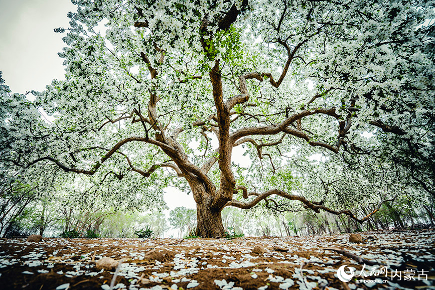 Photo shows a century-old crabapple tree blossoming at the foot of the Yin Mountains in Urad Rear Banner, north China's Inner Mongolia Autonomous Region. (Photo/People's Daily Online)