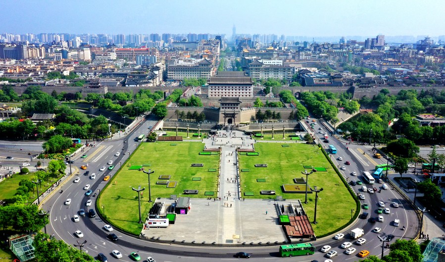This aerial photo taken on April 25, 2023 shows a view of the Yongning Gate of the ancient city wall in Xi'an, northwest China's Shaanxi Province. (Xinhua/Liu Xiao)