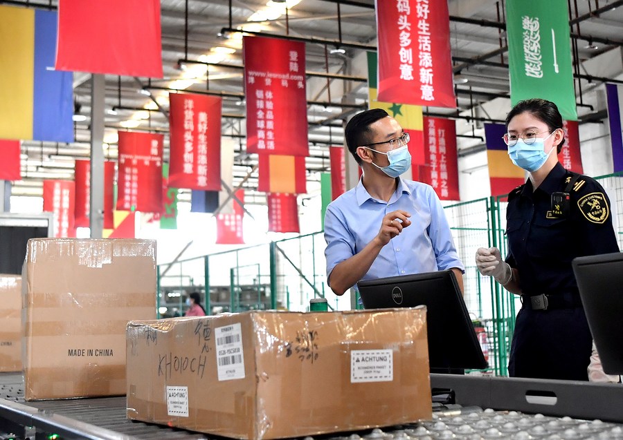 Yuan Zhaohui (L) talks with a customs officer at the comprehensive bonded zone in Xi'an, northwest China's Shaanxi Province, June 3, 2021. (Xinhua/Liu Xiao)