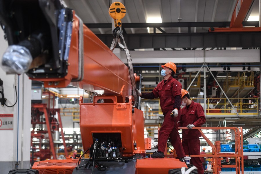 People work at the workshop of Zhejiang Dingli Machinery Co., Ltd. in Deqing County, east China's Zhejiang Province, March 3, 2020. (Xinhua/Huang Zongzhi)