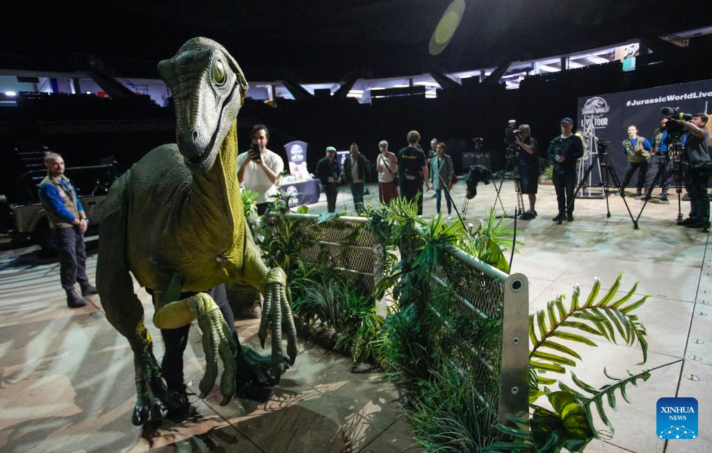 Members of the media interview a behind-the-scene preview of the Jurassic World Live Tour show in Vancouver, British Columbia, Canada, on May 12, 2023. The behind-the-scene preview of the making of the Jurassic World Live Tour show was presented here on Friday. The show will be held here from May 19 to May 28. (Photo by Liang Sen/Xinhua)