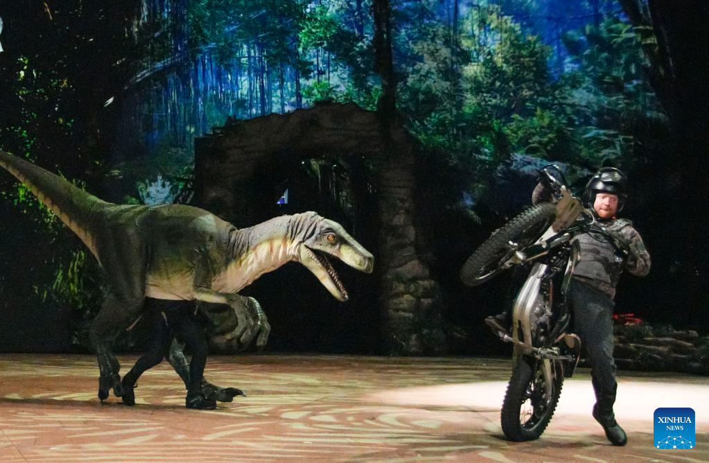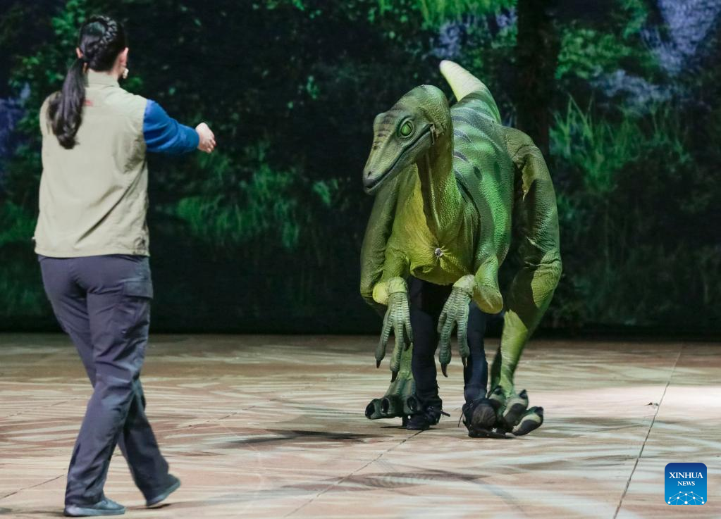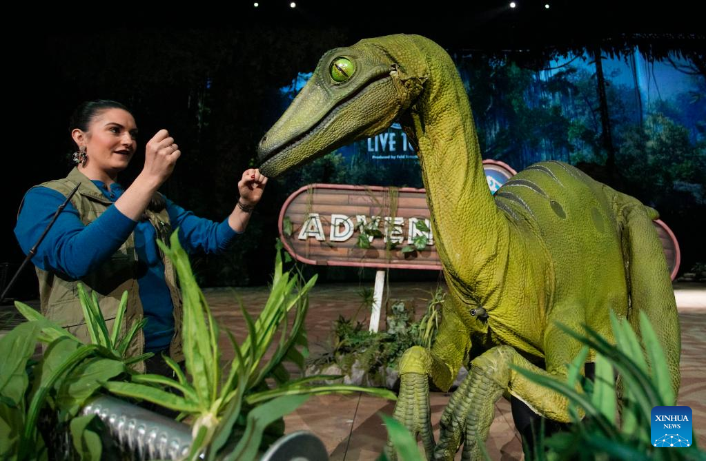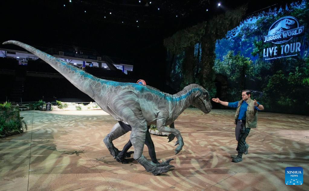 Cast members rehearse during a behind-the-scene preview of the Jurassic World Live Tour show in Vancouver, British Columbia, Canada, on May 12, 2023. The behind-the-scene preview of the making of the Jurassic World Live Tour show was presented here on Friday. The show will be held here from May 19 to May 28. (Photo by Liang Sen/Xinhua)
