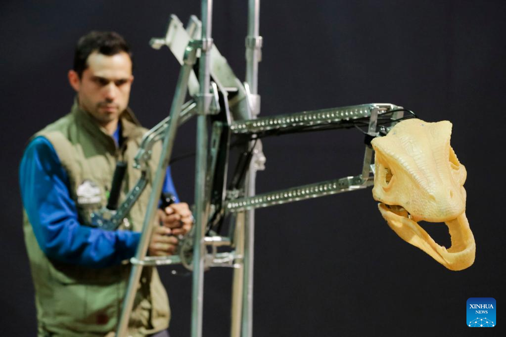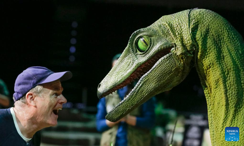 A member of the media takes a closer look at the head of a "dinosaur" during a behind-the-scene preview of the Jurassic World Live Tour show in Vancouver, British Columbia, Canada, on May 12, 2023. The behind-the-scene preview of the making of the Jurassic World Live Tour show was presented here on Friday. The show will be held here from May 19 to May 28. (Photo by Liang Sen/Xinhua)
