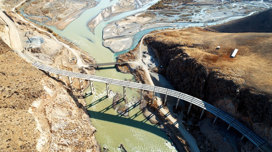This aerial photo taken on Oct. 27, 2020 shows the construction site of the second phase of the north-south highway built by China in Kyrgyzstan. (China Road&Bridge Corporation/Handout via Xinhua)