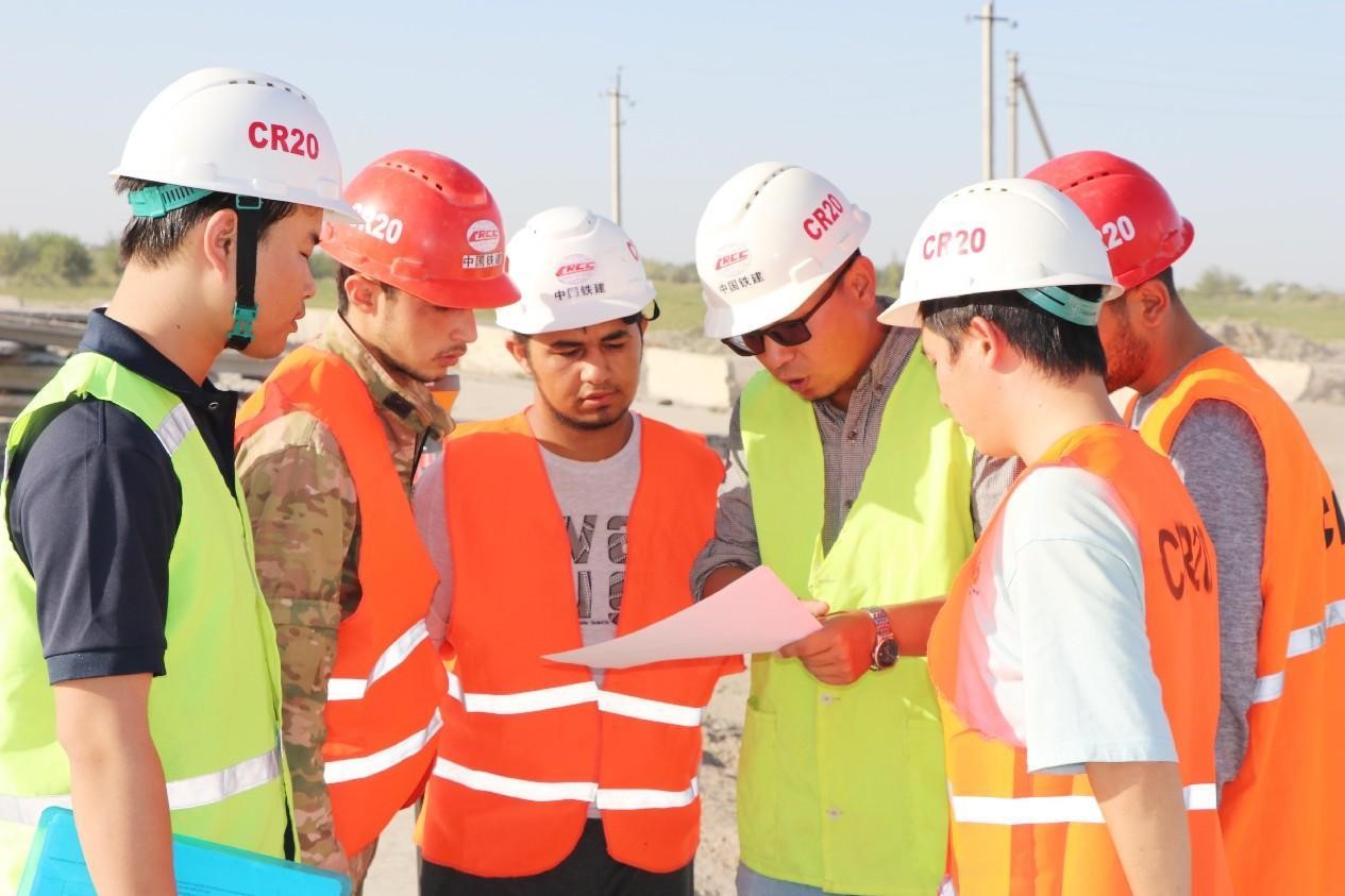 Chinese and foreign engineers work at the construction site of the A380 highway in Uzbekistan, which is contracted by China Railway Construction Corporation. (Photo provided by China Railway 20 Bureau Group Corporation)