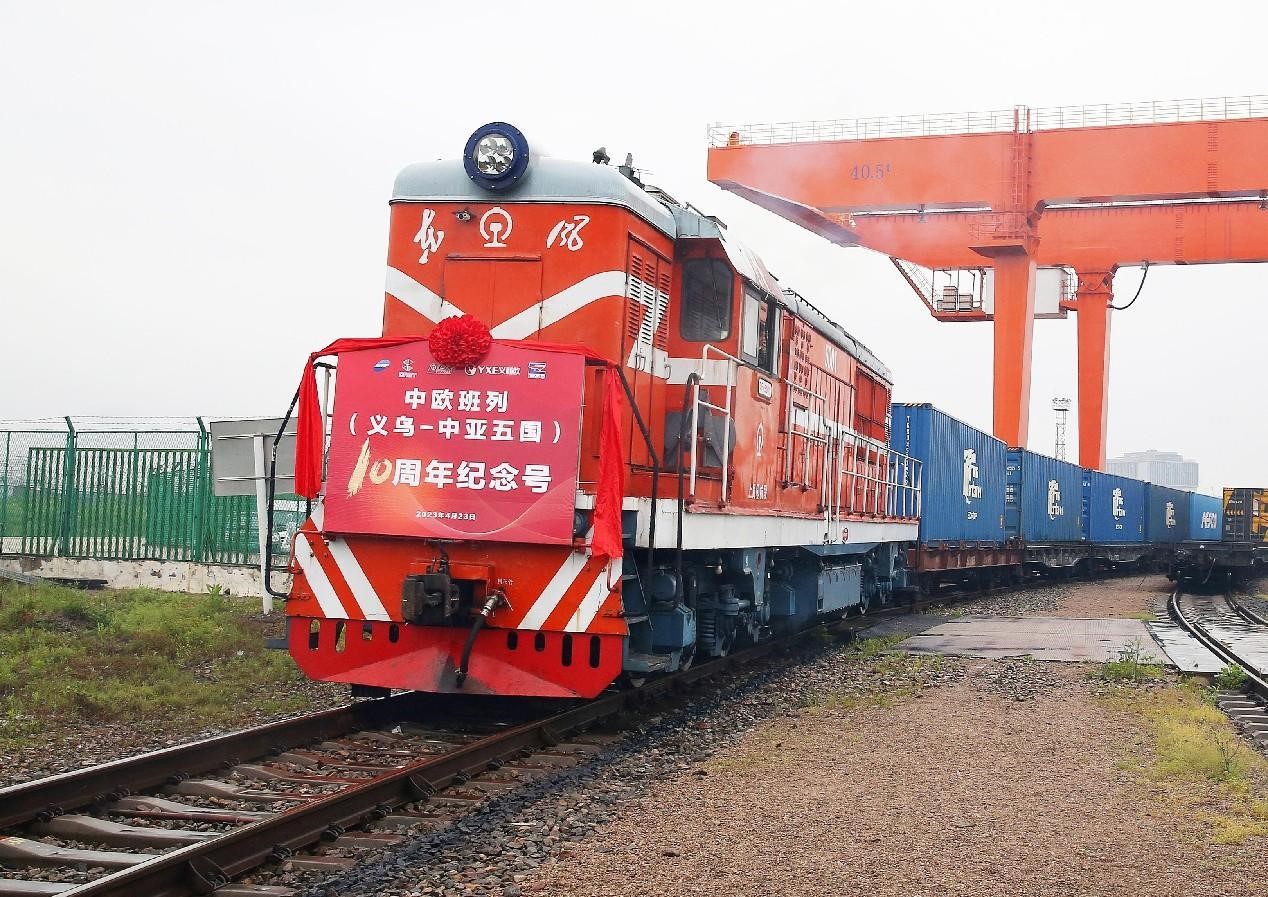 A train commemorating the 10th anniversary of starting the Yiwu-Xinjiang-Europe freight train service departs from Yiwu, east China's Zhejiang province, for Central Asia, carrying 100 twenty-foot equivalent units of goods, April 23, 2023. (People's Daily Online/Gong Xianming)