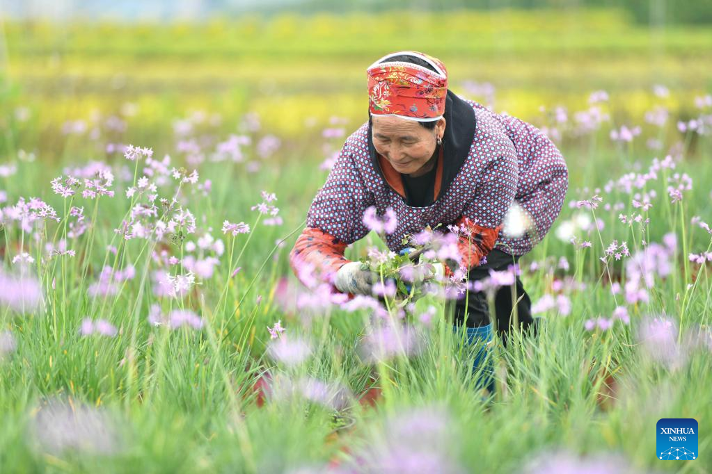 A villager works at a flower base in Wenfeng Village, Jiuzhou Township, Huangping County of Qiandongnan Miao and Dong Autonomous Prefecture, southwest China's Guizhou Province, May 13, 2023. With flowers blooming in the early summer, the flower industry in China witnesses robust growth. (Photo by Liang Wen/Xinhua)