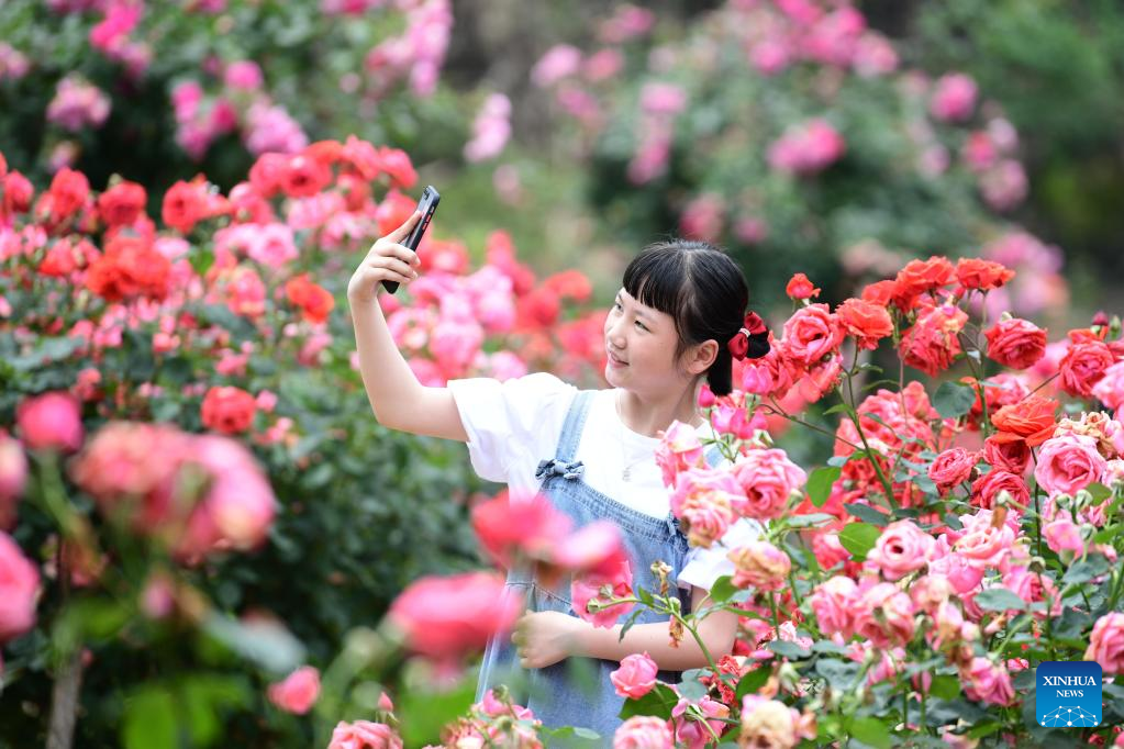 A girl enjoys flowers at a flower base in Dongmen Village, Jiuzhou Township, Huangping County of Qiandongnan Miao and Dong Autonomous Prefecture, southwest China's Guizhou Province, May 13, 2023. With flowers blooming in the early summer, the flower industry in China witnesses robust growth. (Photo by Wang Chao/Xinhua)