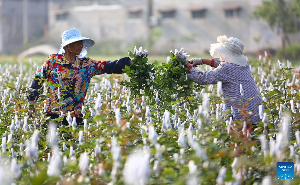 Farmers pick up roses at a flower cultivation base in Jiangtun Township of Tengzhou City, east China's Shandong Province, May 13, 2023. With flowers blooming in the early summer, the flower industry in China witnesses robust growth. (Photo by Li Zhijun/Xinhua)