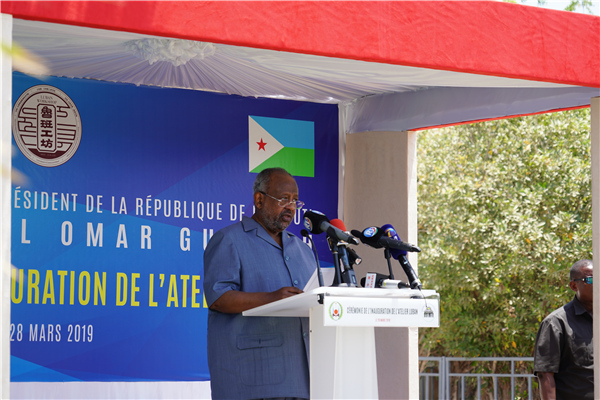 Djibouti President Ismail Omar Guelleh delivers a speech at the launching ceremony of the Djibouti Luban Workshop, March 28, 2019. (Photo courtesy of Tianjin Railway Technical and Vocational College)