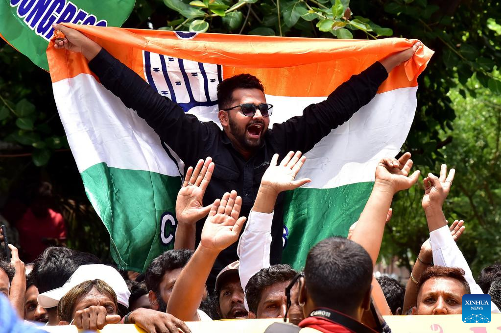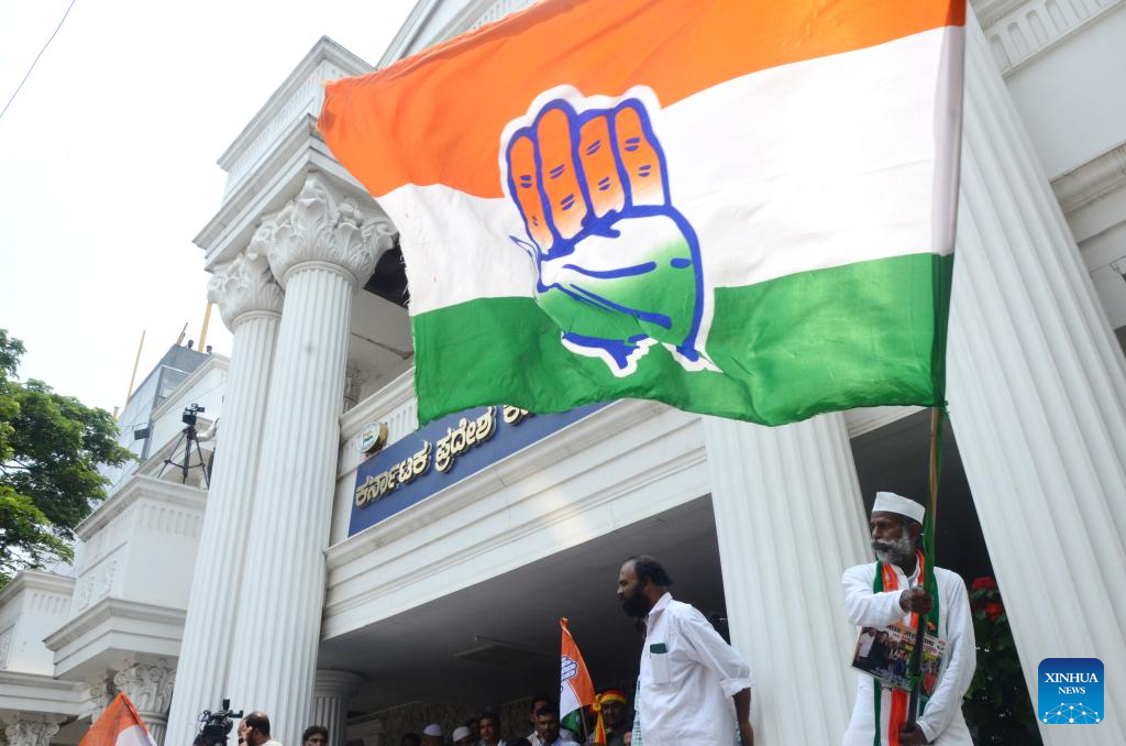 Supporters of Indian National Congress (INC) carrying party flag celebrate the party's victory in the Karnataka state assembly election in Bengaluru, India, May 13, 2023. India's main opposition party, the Indian National Congress (INC), on Saturday won the recently-held Assembly elections in the southern state of Karnataka, unseating the current ruling party, Bharatiya Janata Party (BJP). (Str/Xinhua)