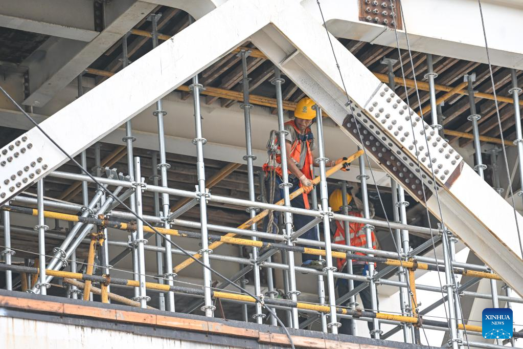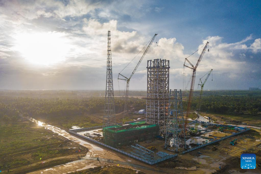 Workers perform tasks at a construction site of the Hainan commercial spacecraft launch site in Wenchang City, south China's Hainan Province, May 13, 2023. (Xinhua/Pu Xiaoxu)