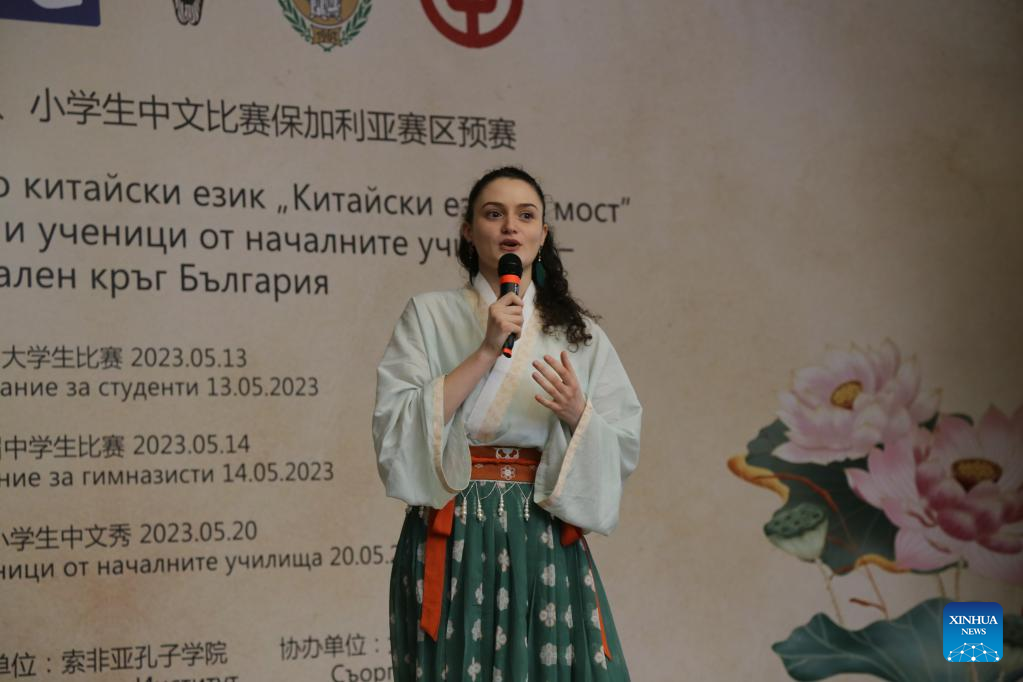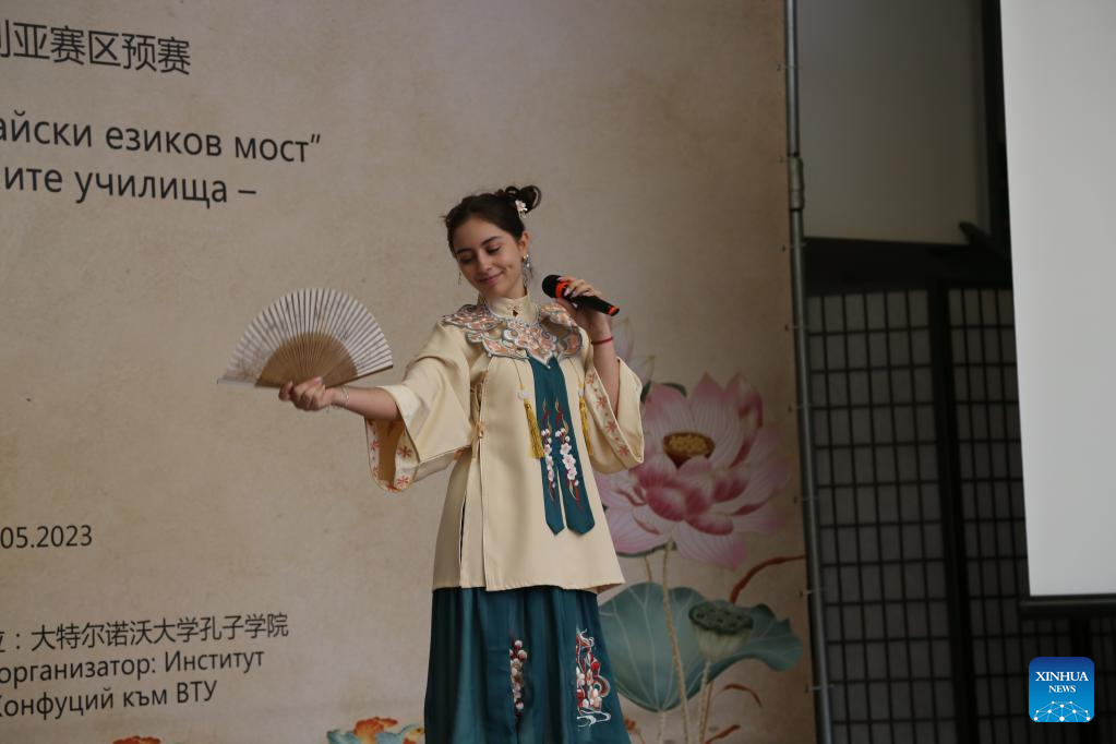 A contestant competes in a Bulgarian national qualification of the 22nd "Chinese Bridge" in Sofia, Bulgaria, May 13, 2023. (Xinhua/Lin Hao)