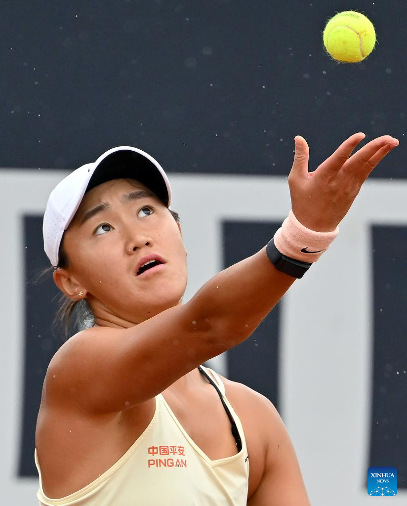 Wang Xiyu of China serves during the round of 32 match between Wang Xiyu of China and Taylor Townsend of the United States at the WTA Italian Open in Rome, Italy, May 13, 2023. (Photo by Alberto Lingria/Xinhua)