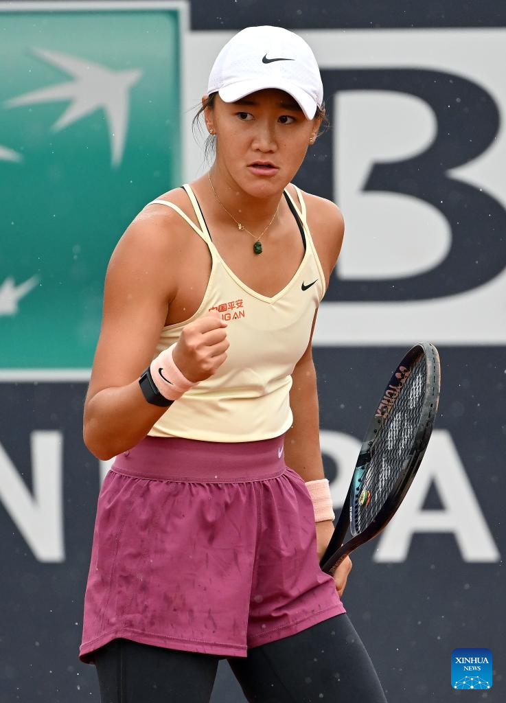 Wang Xiyu of China celebrates scoring during the round of 32 match between Wang Xiyu of China and Taylor Townsend of the United States at the WTA Italian Open in Rome, Italy, May 13, 2023. (Photo by Alberto Lingria/Xinhua)