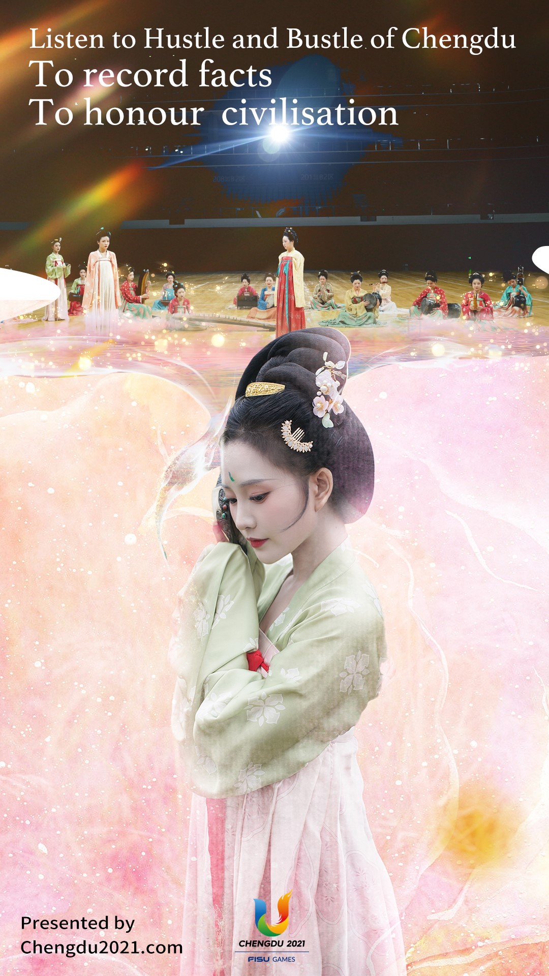 The Twenty-four Musicians and Dancers, a royal orchestra from over 1,000 years ago, performed specifically for big occasions. A thousand years later, the orchestra is being summoned by a grand event. Sounds are being collected with a conch shell creating harmonies for the Chengdu 2021 FISU Games.