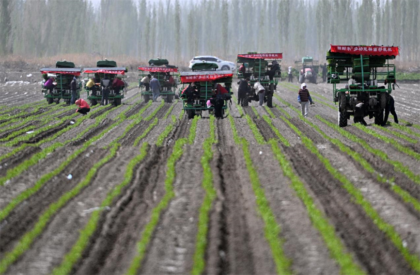 Pepper seedling transplanter machines work in a field in Baoerhai village, Yanqi Hui Autonomous County, Bayingolin Mongolian Autonomous Prefecture of northwest China's Xinjiang Uygur Autonomous Region. (Photo/Que Hure)